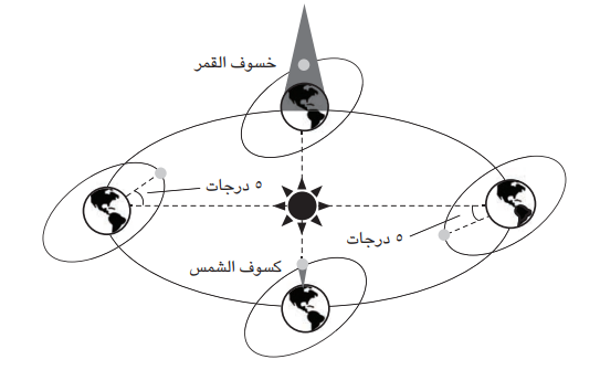 شكل 1: كيفية حدوث ظاهرتي الكسوف والخسوف نظرًا إلى الشكل الإهليلجي لمدار القمر وميله، نادرًا ما يحدث الكسوف الكلي للشمس، كما هو مُلاحظ من أي مكان على الأرض.