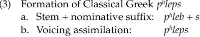 Allomorphs are often the product of assimilations like the one that takes /d/ to [t] in words like jumped, baked, or kissed, or that takes *phleb s to phleps. In the case of the English past tense suffix, the voicelessness of the final consonant in the verb spreads forward to the suffix in what we call progressive assimilation. In the Classical Greek example, the voicelessness of the nominative suffix moves in the opposite direction. We call this regressive assimilation.