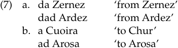 In the Vallader dialect of Rumantsch, the prepositions da ‘from’ and a ‘to’ become dad and ad respectively before words beginning with a vowel: