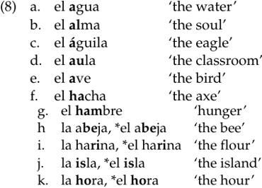 All of the Spanish nouns above are feminine, which may surprise you if you know already that el is the masculine definite article, and la is the feminine. In Spanish, la must be replaced by el before a feminine noun that begins with a stressed [a] (8a–g). This does not occur before any other vowel sound, as shown by the last two examples (8j, k). We include (8h) and (8i) because both abeja and harina begin with [a] but are stressed on the penultimate (second-to-last) syllable. This exempts them from the la → el rule.