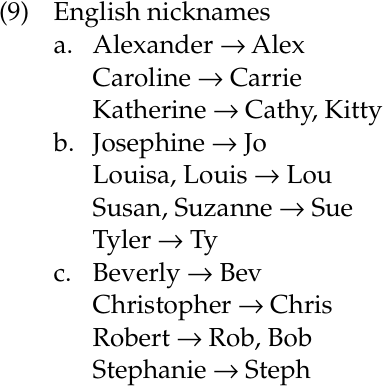 Even if we were to keep going, we would find that any nickname we can think of falls into one of these three sets. They are either polysyllabic (9a) (in this case, bisyllabic) names or monosyllabic names (9b–c) that have either a diphthong, a coda, or both. No native English nick names consist of a single, light syllable. From this data, it seems that English falls in with the set of languages that have a minimal word constraint. Even the shortest of names, nicknames, must consist minimally of a heavy syllable or two light syllables. And it is difficult, if not impossible, to find an English content word that contradicts this conclusion.