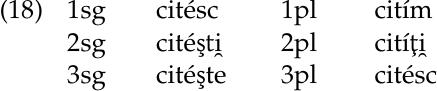 Although the classical conception of morpheme is a pairing between sound and meaning, we have defined it as the smallest grammatically significant unit in a word. What makes the development of -esc in the Romance languages distinctive is that its function was phonological, rather than syntactic or semantic. It is meaningless. We can exemplify this by looking at the paradigm of a verb that contains this morpheme. As seen below, the suffix occurs in the first, second, and third person singular and third person plural of the present indicative of the verbs that have it (so-called fourth conjugation verbs) in Romanian, illustrated here by a citi ‘to read’ (Rudes 1980: 333). (It also occurs in these persons in the present subjunctive and imperative.) But the core meaning of verbs does not change depending on the subject:
