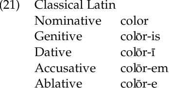 The tendency for languages to prefer regular paradigms over irregular ones sometimes leads to leveling, the elimination of sound alternations that do not signal important differences in meaning. A classic example of leveling comes from Latin. In Prehistoric Latin, the stems of words like colōs ‘color’ and honōs ‘worth’ ended in -s throughout the nominal paradigm:2