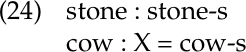 Informally, conocer is to conocí as vencer is to X, solved as vencí. More broadly, four-part analogy is used to describe the generalization or extension of a morphological pattern across (as opposed to within) paradigms (Hock 1991: 168). Through it, whole classes of words come to behave more similarly. Hock gives the example of English plurals. It is because of four-part analogy that the plural of cow is cows, replacing the earlier form kine. The new plural cows generalizes the plural formation familiar from other words, such as stone, stones, as in (24). Here, as in most instances of analogy, the pattern that serves as the basis of the analogy (in this case the regular plural suffix -s) is more productive.
