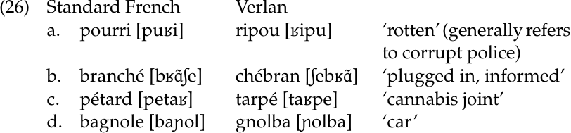 For Bullock (1996), the interesting question is how the phonology of secret languages like verlan compares to the phonology of the language they are based on. We see that verlan respects the basic syllable structure of French. French speakers who use verlan are aware on some level of prosodic entities such as onset, nucleus, coda, and syllable. (The same can be said of English speakers who use Pig Latin.) Nonetheless, Bullock and other researchers who have looked at French secret languages note that the phonology of verlan is not the same as that of the standard language. We see in (26d) that [ɲ] is a licit onset in verlan. It is not in standard French. Furthermore, in verlan, only the liquids [l] and [ʁ] are permitted in the codas of polysyllabic words. Bullock presents the example of bifton ‘cash, banknotes’, syllabified in standard French as bif.ton. In verlan, it would become fton. bi [ftõ.bi], because [f] cannot form the coda of a polysyllabic word. This example deviates from standard French phonology in another way: [ft] is not a possible onset in French. Finally, it is significant that we formulated the constraint on codas by referring to “polysyllabic words.” In verlan monosyllables, consonants other than [l] and [ʁ] are welcome in word codas: