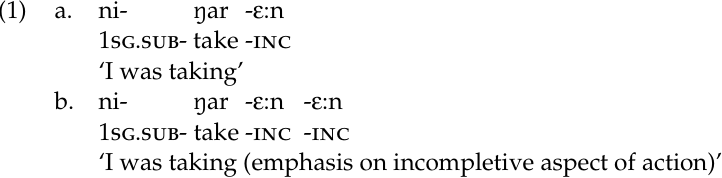 Another example of a compositional form is the Kujamaat Jóola dubitive-incompletive, which expresses an action that was never completed or whose existence is in doubt. For emphasis, the dubitive-incompletive suffix (INC) is doubled (1b). It can even be repeated several times (Thomas and Sapir 1967: 350, note 2):
