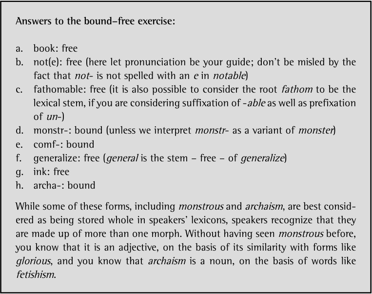 We can characterize the stem an affix attaches to as bound or free and as belonging to a particular lexical category. Take the following words formed via prefixation with re-: