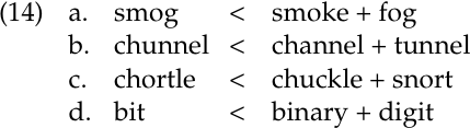 Blending is an example of creative language use. It generally does not adhere to strict constraints, as does affixation. For example, we note in (14d) that bit comes from ‘binary digit’. Nothing in the grammar would have prevented speakers from coining the word *binit from the same parts. The word-formation processes discussed below, including acronym formation, clipping, folk etymology, and backformation, are treated by linguists separately from productive derivational (lexeme formation) phenomena.