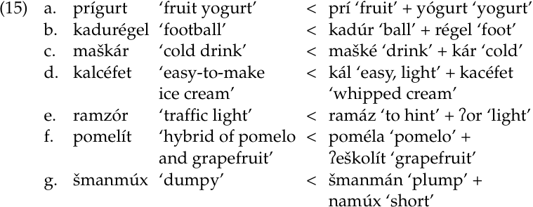 Neither blending nor any of the other derivational processes we have been talking about is limited to English, of course. While blends are rare or absent in many Indo-European languages, they are common in Hebrew, examples of which are given below (Bat-El 1996), and Japanese: