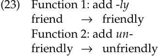 To determine the order of functions leading to a form, it helps to consider other words that contain the same parts. Consider the example of unfriendly. Un- attaches to nouns only in exceptional cases (for example, uncola, a word once used in an ad campaign for a particular soda). However, it regularly attaches to adjectives. We use this fact in determining that the function ‘Add -ly’, which forms adjectives, must come before the function ‘Add un-’.