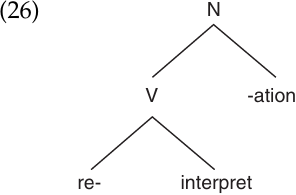(25a) tells us that reinterpretation is the act of reinterpreting, from reinterpret, not re- the act of interpreting. We start out with a verb, interpret, form a new verb via the prefix re-, and finally form a noun by adding the suffix -ation. In the case of poststructuralist, we start out with the noun structure, make an adjective via the adjectival suffix -al, create a new adjective by adding the suffix -ist, and a further one by adding the prefix post-. Poststructuralist (structuralist, too) can in turn be made into a noun by zero-derivation.