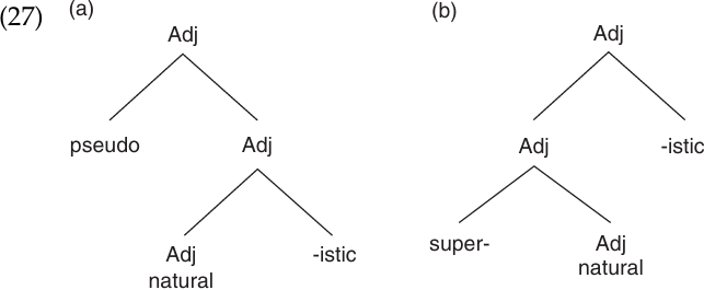In both cases we start out with the adjective natural, which we purposely have not broken down into nature and -al, although we could have. In (27a) we first make a new adjective, naturalistic, which we then modify with the prefix pseudo-, yielding a word with the meaning ‘falsely naturalistic’. In (27b), however, we take the adjective natural and add the prefix super- to it, giving supernatural ‘pertaining to an existence outside the natural world’. It is to this form that we add the suffix -istic. English morphology is such that we could form a different supernaturalistic, this time with the same structure as pseudonaturalistic in (27a). This supernaturalistic would mean ‘really naturalistic’.1