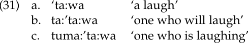 The following set of examples involves reduplication of the first syllable (31b) and infixation of -um- (31c) (Bloomfield 1933: 221). The failure of the infix to participate in reduplication tells us that the infix is not inserted until after the first syllable has been reduplicated. Otherwise, we would expect *tutuma:wa, which we don’t find: