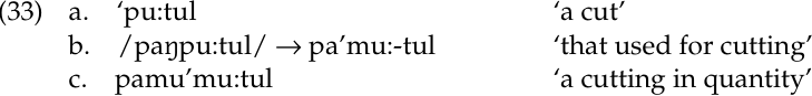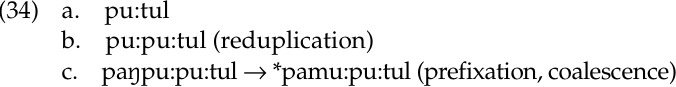 We begin with pu:tul ‘cut’ (33a). If we add the prefix paŋ- to it, the final nasal /ŋ/ coalesces with the following stop, yielding [m] (33b). We then reduplicate the first syllable of the internal stem, giving (33c). The reduplication doesn’t take place at the beginning of the word; it takes place inside. Ordering reduplication before prefixation yields the wrong form: