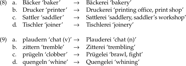 The German suffix -ei is like -ism in having at least two very highly lexicalized meanings. The first, illustrated by the words in (8), attaches to a noun and makes another noun meaning ‘the place in which X works’. The second, seen in (9), attaches to a verb stem and creates a noun referring to the ‘act of doing X’: