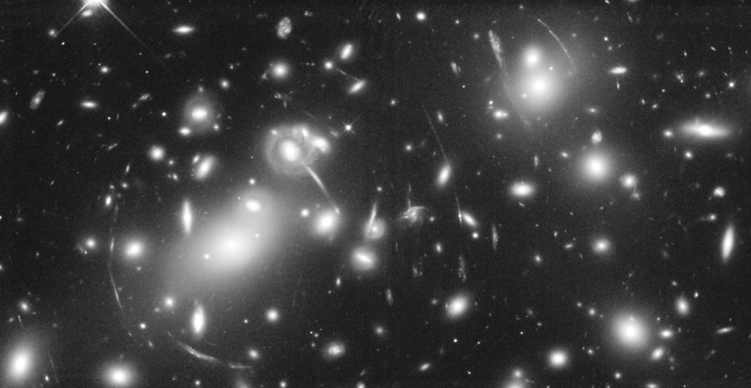 This photo taken by the Hubble Space Telescope shows a cluster of distant galaxies whose combined gravity distorts and bends the light these objects give off.