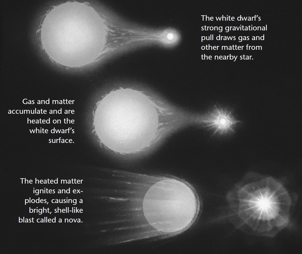 If a white dwarf has a nearby companion, gas expelled from the companion may fall onto the dwarf. . . . Coming from the companion’s outer layers, such gas is rich in hydrogen and may briefly replenish the white dwarf’s fuel supply. The new fuel forms a layer on the white dwarf’s surface, where gravity compresses and heats it. The gas layer eventually reaches the ignition temperature for hydrogen, but . . . nuclear burning in a degenerate gas can be explosive. The detonating hydrogen is blasted into space and forms an expanding shell of hot gas . . . that radiates far more energy than the white dwarf itself. Sometimes these stellar explosions are visible to the naked eye. When earlier astronomers saw such events, they called them novas, from the Latin word for “new,” because the explosion would make a bright point of light appear in the sky where no star was previously visible.