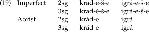 In (19), -š is a preterite suffix and -e is 3sg agreement. We see here that a single inflectional form such as kráde may express more than one set of morphosyntactic features: 2sg aorist or 3sg aorist.