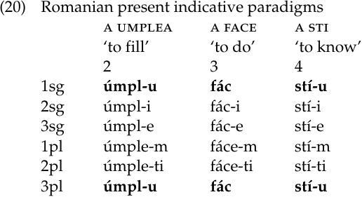 Romanian also displays widespread syncretism. For many verbs, the first-person singular in the present indicative paradigm is identical to the third person plural form. We show this in (20). Both 1sg and 3pl forms are in boldface (data from Stump 2001: 213–14):