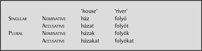 The basic typology has to do with a scale running from analytic to synthetic languages, which encodes the degree to which the individual meaningful elements in a language are expressed separately. At the analytic end we have the isolating languages, of which Vietnamese is the prototypical example, because the only morphology it has is com pounding. It has no derivational or inflectional processes of any kind. The next type is inflective, of which the more analytic subtype is agglutinating. An agglutinating language like Turkish or Hungarian has affixes, but they are strung out quite separately, each expressing a single notion, and easily identified. Consider the following simple table of Hungarian words: