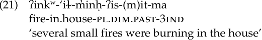 The last stop on this continuum is polysynthetic languages. The languages of this type cited most often come from North America. One example of a polysynthetic language is Nuuchahnulth (called Nootka in earlier literature), a language spoken on Vancouver Island in British Columbia (see Stonham 2004, who reanalyzes data originally published by Sapir 1921 and recasts them according to modern transcription conventions). In Nuuchahnulth and other polysynthetic languages, speakers can build complex words that express what a speaker of English or Vietnamese would express using several words or even an entire, multiword sentence. Following is an example from Nuuchahnulth (Stonham 2004: 65). /kw/ is a labialized velar stop; /m̓/ is a glottalized labial nasal consonant; /ḥ/ is a pharyngeal fricative. The final /a/ is a variable-length vowel (see Stonham 2004: 24–6), although not marked as such here.