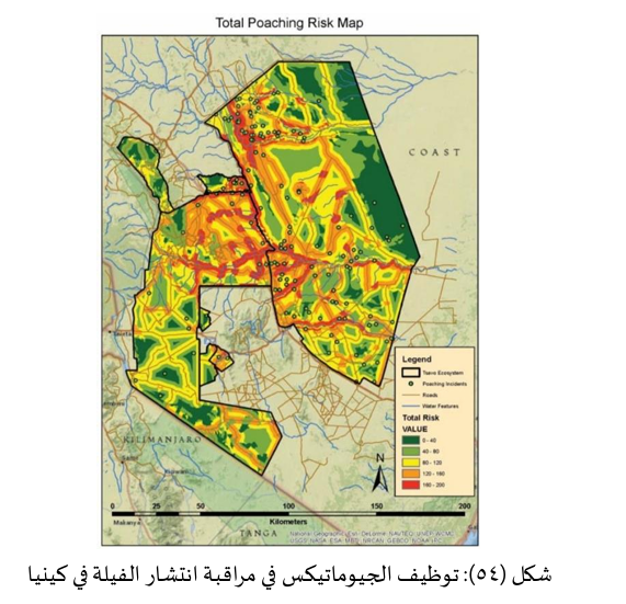 تستخدم الحكومات والمنظمات غير الحكومية الجيوماتكس لمراقبة المناطق المحمية تغير الغطاء الحرجي في المتنزهات الوطنية، الأنشطة غير القانونية لنمذجة ممرات الحياة البرية ضمان اتصال المواطن البيئية بتحليل خرائط الغطاء الأرضي والطبوغرافيا ولإدارة الموارد الطبيعية بشكل مستدام في كينيا، يُستخدم GIS لمكافحة الصيد غير المشروع بتحليل الأنماط المكانية للدوريات والحوادث في المحميات في النرويج يُستخدم الاستشعار عن بعد لمراقبة السواحل الشاسعة الفصل الحادي عشر تطبيقات الجيوماتيكس بحثاً عن الصيد غير القانوني أو التلوث مثل بقع النفط التي تظهر عبر صور الرادار.