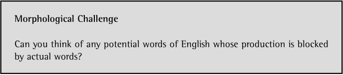 Blocking is an economy principle that can be thought of informally as an injunction to avoid coining synonyms: if you already have a good expression for something, don’t invent another one. Clear evidence that blocking is based on the avoidance of creating synonyms comes from syntax, where it operates just as it does in morphology. Why, for example, do we say this morning, this afternoon, this evening, but not *this night? This expression is blocked by tonight. Remember that blocking does not constrain forming words, but rather forming words with particular meanings, which means that a word may be blocked in one sense but not in another. And indeed, this night is acceptable when it has a different sense from the blocked one, as in the phrase “Why is this night different from all other nights?” where this is used in a more purely demonstrative way. Similarly, while the day before yesterday or the day after tomorrow are both common expressions, we cannot say *the day before today or *the day after today, because we already have the words yesterday and tomorrow with these exact meanings. French, by contrast, has the expression avant hier for the equivalent of the day before yesterday and après demain for the equivalent of the day after tomorrow, so French also blocks the translationally equivalent expression of these phrases, which are perfectly acceptable in English, because we have no word for them. The constraint is thus the same across all languages, but its results depend on the individual existing words of each one.