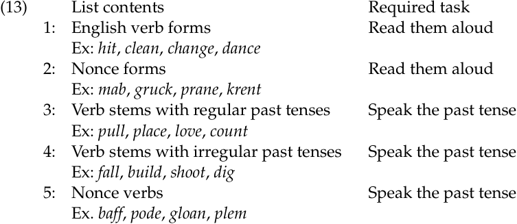 Jaeger et al. set out to shed light on these competing types of models, which they call single-system theories and dual-system theories (see single-route and dual-route models). Nine subjects viewed five lists of words or nonce forms. They were required to give a spoken response to each form, one at a time. The five lists were as follows: