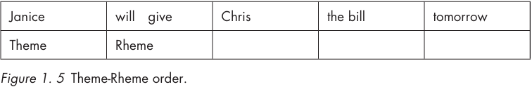 Here, the speaker organizes the informational content of the clause so as to establish whatever point of departure is desired for the message. This is called the Theme, which in English coincides with the initial element or elements of the clause. The rest of the clause is the Rheme: