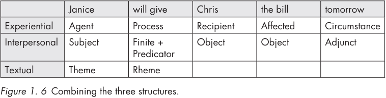 The three types of structure are here mapped simultaneously onto the example clause, in order to show the tripartite nature and analysis of English clauses from a functional point of view. Predicator, Objects and Adjunct are included as syntactic elements or functions, which correspond to the semantic roles.