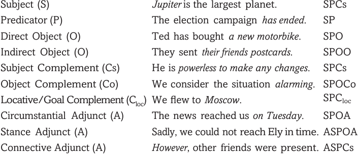 Clauses have the greatest number of syntactic elements or functions of all classes of unit. The criteria for their identification. Here we simply list and exemplify the clause elements within common clause structures. The type of structure used in order to express a ‘situation’ or ‘state of affairs’ depends to a great extent on the verb chosen.
