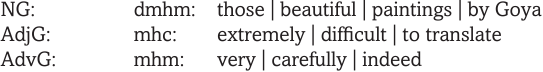Nominal groups, adjectival groups and adverbial groups are composed of three primary elements or functions: a head (h) preceded by a pre-modifier (m) and followed by a post-modifier (m). We also distinguish ‘complement’ (c) as a special type of post- head element. Complements of nouns and adjectives are introduced by a preposition or by a that-clause which is controlled by the head-word of the group. For example, the adjective good controls a complement introduced by at: good at chess. The noun belief controls a that-clause: the belief that he is always right. In the case of nominal groups, we also distinguish between ‘modifiers’, which describe or classify the head, and ‘determiners’ (d), which specify it in terms of definiteness, quantity, possessiveness, etc. Thus, we give the determiner and the pre- and post-modifiers equal syntactic status as primary elements of nominal groups. The following are examples of these group structures: