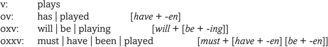 The lexical verb is sometimes followed by an adverbial particle (symbolized by ‘p’) as in ring up, break out, take over. Many such combinations form integrated semantic units which are idiomatic. Transitive combinations can be discontinuous as in I’ll ring you up, They’ve taken it over.