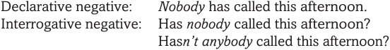 Another way of negating a clause is by using a non-verbal ‘nuclear’ negative word such as nobody, nothing, no or never. When we need a negative element as subject, a nuclear form is necessary: Nobody came after all, Nothing was said, No money was found. Nuclear negative words are also common in existential clauses: There’s nothing to worry about.