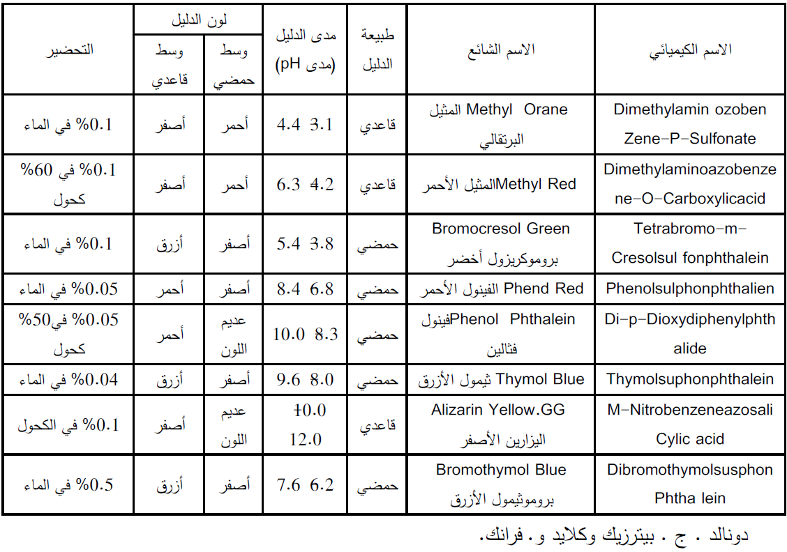 الجدول يوضح الأدلة المستخدمة في معایرات التعادل ومدى pH التي تعمل فیه والاسم الكیمیائي والاسم الشائع وطریقة التحضیر