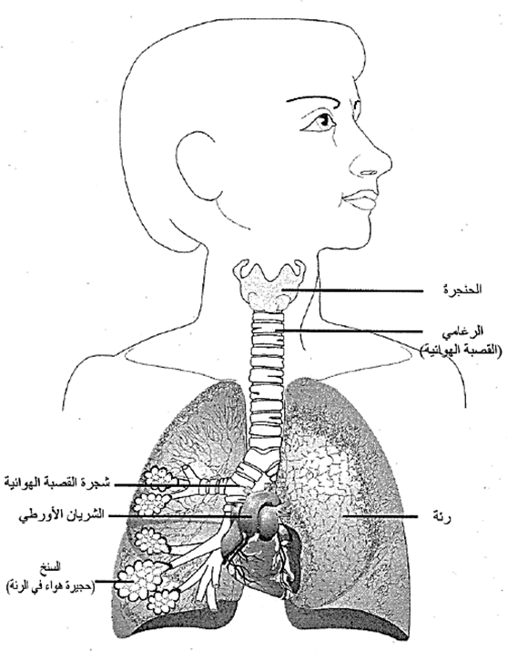 الغاية من الجهاز التنفسي تبادل الأكسجين وثاني أكسيد الكربون بين الأسناخ) وهي عبارة عن أكياس هوائية دقيقة في الرئة( وبين الدم. ويتكون الجهاز التنفسي من الأنف والحنجرة والرغامي والقصبات الهوائية والرئتين والجَنَبة الرِّئوية (غشاء الجنب (الشكل ادناه . حيث يدخل الهواء من خلال الأنف أو الفم ويمر من خلال الحنجرة إلى الرغامي والذي ينقسم إلى القصبات الهوائية اليسرى واليمنى، والتي تصل إلى الرئتين، فتتمدد وتنقبض الرئتان مع حركة القفص الصدري والحجاب الحاجز.