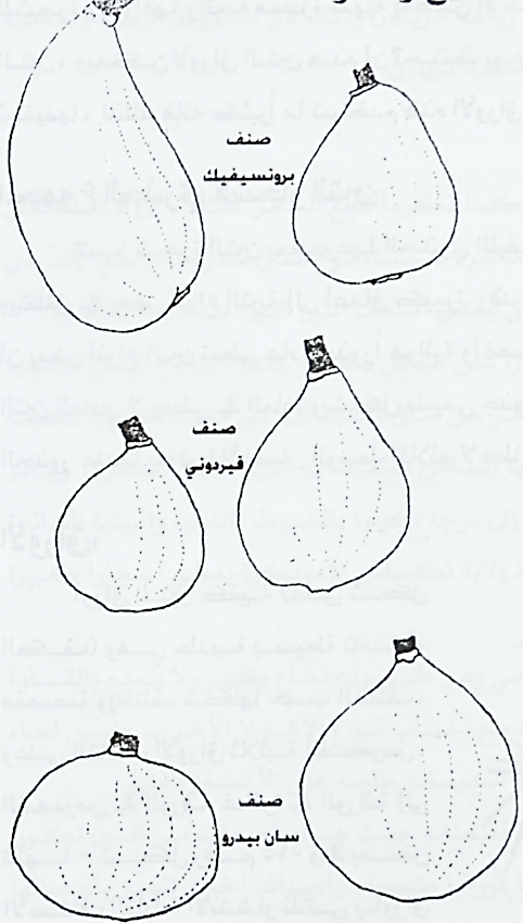 شكل يوضح الفروقات بين اشكال ثمار التين بالارتباط مع زمن القطاف والنضج خلال السنة في الجهة اليسرى ثمار القطاف الاول وفي الجهة اليمني ثمار القطاف الثاني
