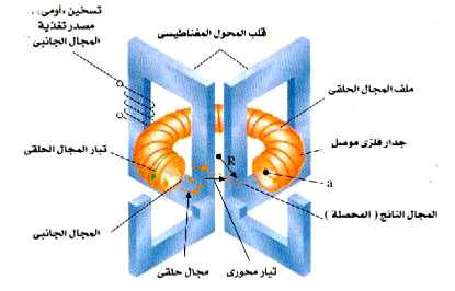 الشكل 1)): نظام توكاماك الاندماجي ، ذو الحصار المغناطيسي، حيث يقوم مجال مغناطيسي مركب بحصر الغاز عند درجات حرارة مرتفعة (بلازما) داخل منطقة على هيئة الدونت (أنبوبة حلقية).