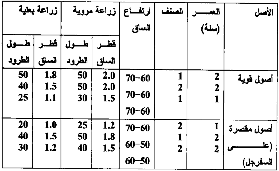 جدول يبين الشروط الفنية الواجب توافرها في غرسة الاجاص (سم)