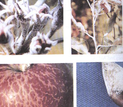 يصيب الفطر كل من الأوراق والأزهار والثمار، تظهر الأعراض على الأوراق بشكل تلطخات بيضاء اللون عبار عن ميسيليوم وجراثيم الفطر وغالبا مدا تظهر على السطح السفلي للأوراق وبتقدم الإصابة يحدث التفاف للأوراق المصابة وأخيرا تسقط الأوراق المصابة في منتصف موسم النمو، وفي حالات الإصابات الشديد يحدث تقزم للأغصان الطرفية وقد تتشوه الأوراق. وتظهر الإصابة على ثمار التفاح والكمثرى بشكل ميسيليوم أبيض اللون خاصة الأشجار المصابة بشدة.