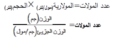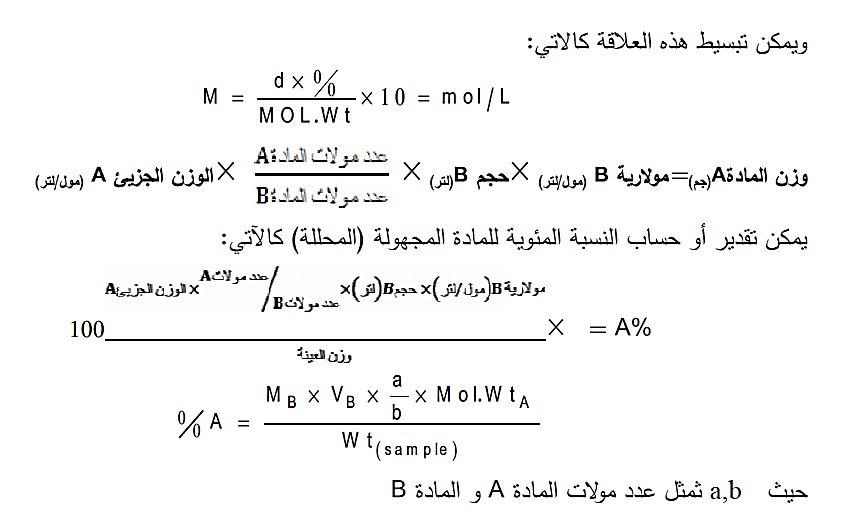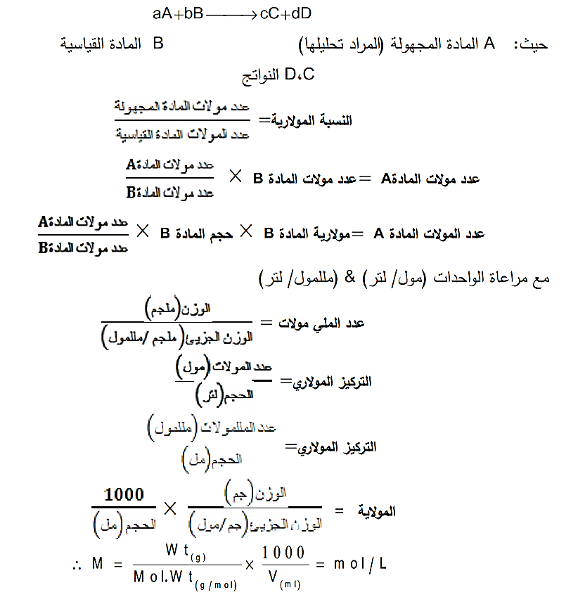 وهذه المعادلة توضح نسبة مولات المواد المتفاعلة وهذه النسب المولیة أساس في عملیة الحسابات ع استخدام التركیز المولاري في التقدیر الكمي الحجمي، و من المعادلة السابقة یمكن الحصول على علاقات أخرى لحساب كمیات أخرى