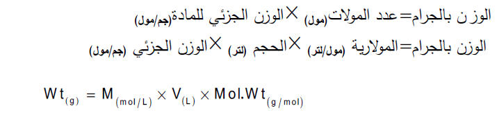 تستخدم هذة العلاقة لحساب مولاریة محلول أى مادة كیمیائیة اذا علمت وزن المذاب (وزن المادة)
