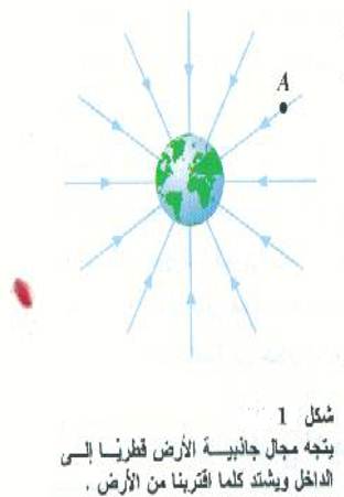 لو أن جسماً وضع عند النقطة A ، فإنه سيتأثر بقوة في اتجاه رأس السهم نحو مركز الأرض. أما الخطوط وتسمى خطوط المجال فإنه تشير إلى اتجاه جذب الأرض؛ وهو ما يعتبر اتجاه مجال الجاذبية ( وفي الحقيقة فإن الشكل (1) لابد وأن يرسم في أبعاد ثلاثة. بحيث تتجه خطوط القوة دائماً ومن جميع الاتجاهات نحو مركز الأرض ).