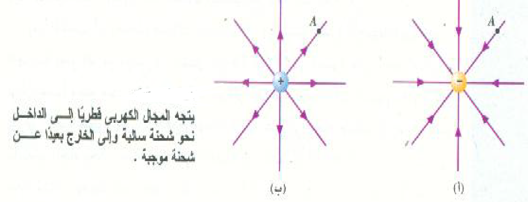 سنعتبر اتجاه المجال الكهربي في نفطة ما على أنه نفس اتجاه القوة المؤثرة على شحنة اختيار موجبة موضوعة في تلك النقطة. ولنفترض مثلاً ان شحنة اختبار موجبة قد وضعت عند النقطة A في الشكل (2 أ). إنها تنجذب قطرياً إلى الداخل، كما يوضح السهم المرسوم عند A وبالفعل، فإن القوة المؤثرة على شحنة الاختبار الموجبة ستتجه قطرياً إلى الداخل بغض النظر عن الموقع الذي تشغله بجوار الشحنة السالبة الموجودة بالمركز. وعلى هذا فإننا سنخمن أن المجال الكهربي يتجه كما هو موضع بالأسهم: يتجه المجال الكهربي بالقرب من شجنة سالبة نحو الشحنة نفسها.
