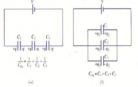 ويوضح الشكل (1 ب) ثلاثة مكثفات متصلة معاً من اطرافها. ويطلق على هذا النوع من التوصيل على التوالي. وسنقوم بإيجاد السعة الكلية المكافئة لهذه المجموعة.