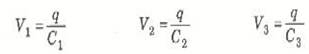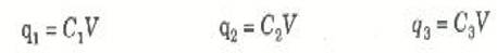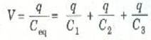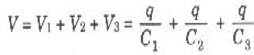 وقد استعملنا هنا حقيقة أن q1/V = C1 وبالمثل بالنسبة للمكثفين C2 و C3.