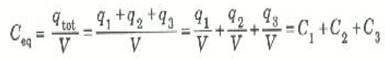 والشحنة الكلية على الألواح اليسرى هي qtot = q1+q2+q3 أما الشحنة الكلية على الألواح اليمنى فهي نفس الشحنة ولكن بإشارة سالبة. والمكثف الذي يكافئ الثلاثة الموضحة في الشكل ((1 سوف يختزن شحنة مقدارها qtot عند فولطية مقدارها V: