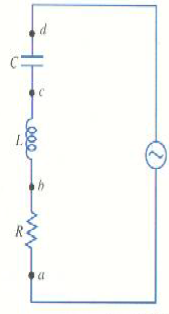 ان دالة تتصل فيها العناصر الثلاثة معاً على التوالي، وهي الدائرة التي تعرف بدائرة LRC على التوالي ويبين إحداهما الشكل (1) ونود الآن تحديد العلاقة ــ كما سبق ــ بين قيم rms للجهد. كما نود أن نحدد علاقة الطور بين القيم اللحظية v و i وفقد القدرة في الدائرة.