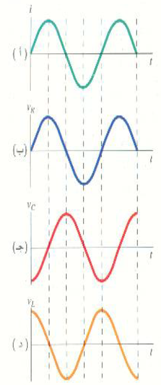 شكل (2) : vR فقط هو المتفق في الطور مع i. اما VL وVC فتختلف في الطور بمقدار (1/4) دورة (90) مع i.