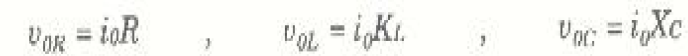ويمكننا الحصول على السعة الخاصة بالجهد الكلي v0 المطبق على الدائرة باللجوء إلى جمع المتجهات المعتاد. فنبدأ أولاً بطرح v0L وv0C المتعارضين كما في الشكل (3 ب). ثم نضيف هذا المتجه الناتج إلى v0R باستخدام نظرية فيثاغورس.